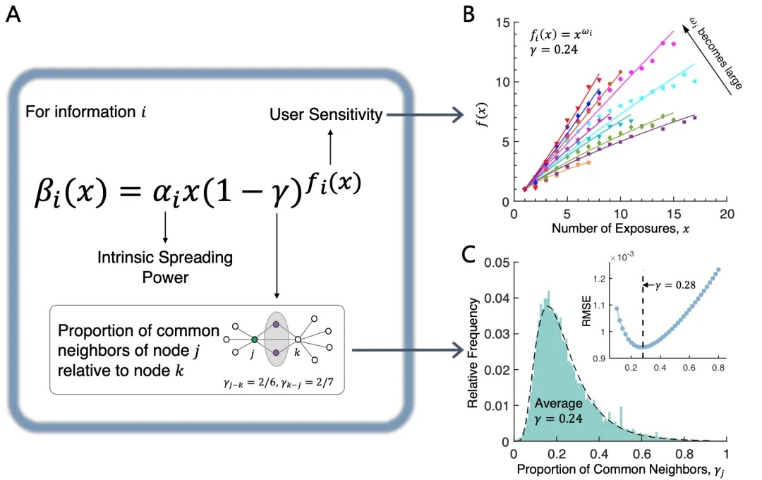 孟凡辉博士及其团队累计分析了数十亿用户的传播行为数据,发现社会强化效应和社会弱化效应在信息传播中普遍共存。研究团队提出一个简洁的数学模型(如上图1),该模型能准确描述不同社交平台上各种类型信息的传播轨迹,并解释领域内存在的多个争议。此外,新模型还揭示了社交网络的高聚类特性(即一个人的多个好友之间也是好友)导致信息呈现出快速、高频、小范围爆发的传播特征,这使得社交媒体在信息传播方面具有高通量和多样性的优势。