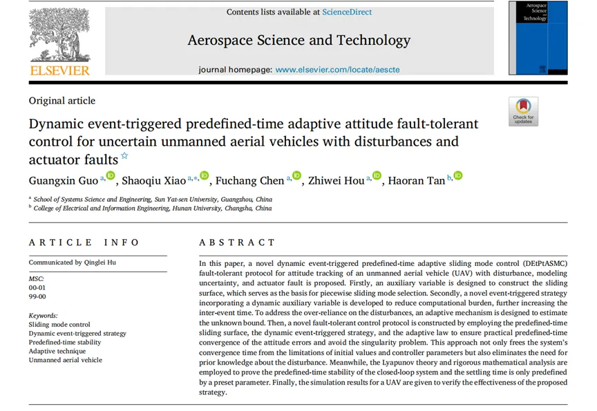 近日,金牌影院 博士研究生郭广信在航空航天领域国际知名期刊《Aerospace Science and Technology》(影响因子:5.8,中科院一区TOP)上发表题为"Dynamic event-triggered predefined-time adaptive attitude fault-tolerant control for uncertain unmanned aerial vehicles with disturbances and actuator faults"的研究成果,郭广信为第一作者,指导老师肖绍球教授为通信作者,学院侯治威副教授和硕士研究生陈富昌共同参与该研究。该研究针对存在扰动、模型不确定性和执行器故障的无人机姿态跟踪问题,提出了一种新的动态事件触发预定义时间自适应滑模容错控制协议(DEtPtASMC),能够使得无人机在存在执行器故障的情况下依然实现预定时间稳定。研究小组通过Lyapunov理论证明了闭环系统的预定义时间稳定性,其收敛时间仅由单一预设参数确定。该项成果为无人机在强扰动、部分故障等极端工况下的可靠运行提供了一种较为完备的理论控制方案。