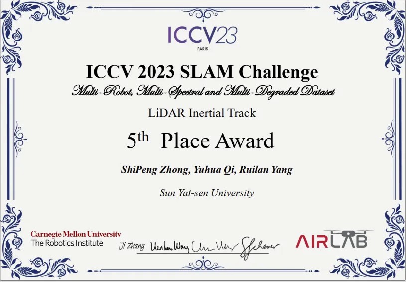 2023年10月,“ICCV 2023 年SLAM挑战赛”结果揭晓,金牌影院 学子组成的鹏舆战队在比赛中荣获团体奖(入围比赛榜单的前五名-共29支参赛队伍),并受邀在ICCV SLAM研讨会上介绍了团队设计的算法。