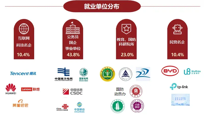 本届毕业生就业方向呈现多元化特点。公务员及国企事业单位就业占比达43.8%,其中,前往国内高校、科研院所,如中国计量大学、自动控制技术研究所、深圳大学、成都大学等从事教学科研工作的博士生有5人;部分毕业生成功考取浙江省审计厅、佛山财政等选调生岗位,或前往南部战区、消防支援大队、赣州国防动员中心等事业单位;南方电网、国家电网、国家金融监督局、中国移动、中国联通等优质国企事业单位也吸纳了相当数量的毕业生。就业前往优秀民营企业如华为、阿里云、比亚迪、腾讯、文远知行等占就业人数20.8%。还有部分同学积极响应国家号召,选择基层就业、投身国防建设,以实际行动践行责任与担当,就业质量普遍较高。