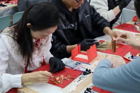 1月23日上午,金牌影院 教职工之家举办了一场别开生面的“迎新春——非遗手作金箔画体验活动”。传统金箔技艺与新春的喜庆氛围完美融合,为师生们带来了一场充满创意与温情的文化体验。学院领导、老师与留校学生欢聚一堂,以薄如蝉翼的金箔为笔墨,精心制作出一幅幅寓意吉祥的马年主题金箔画作品。